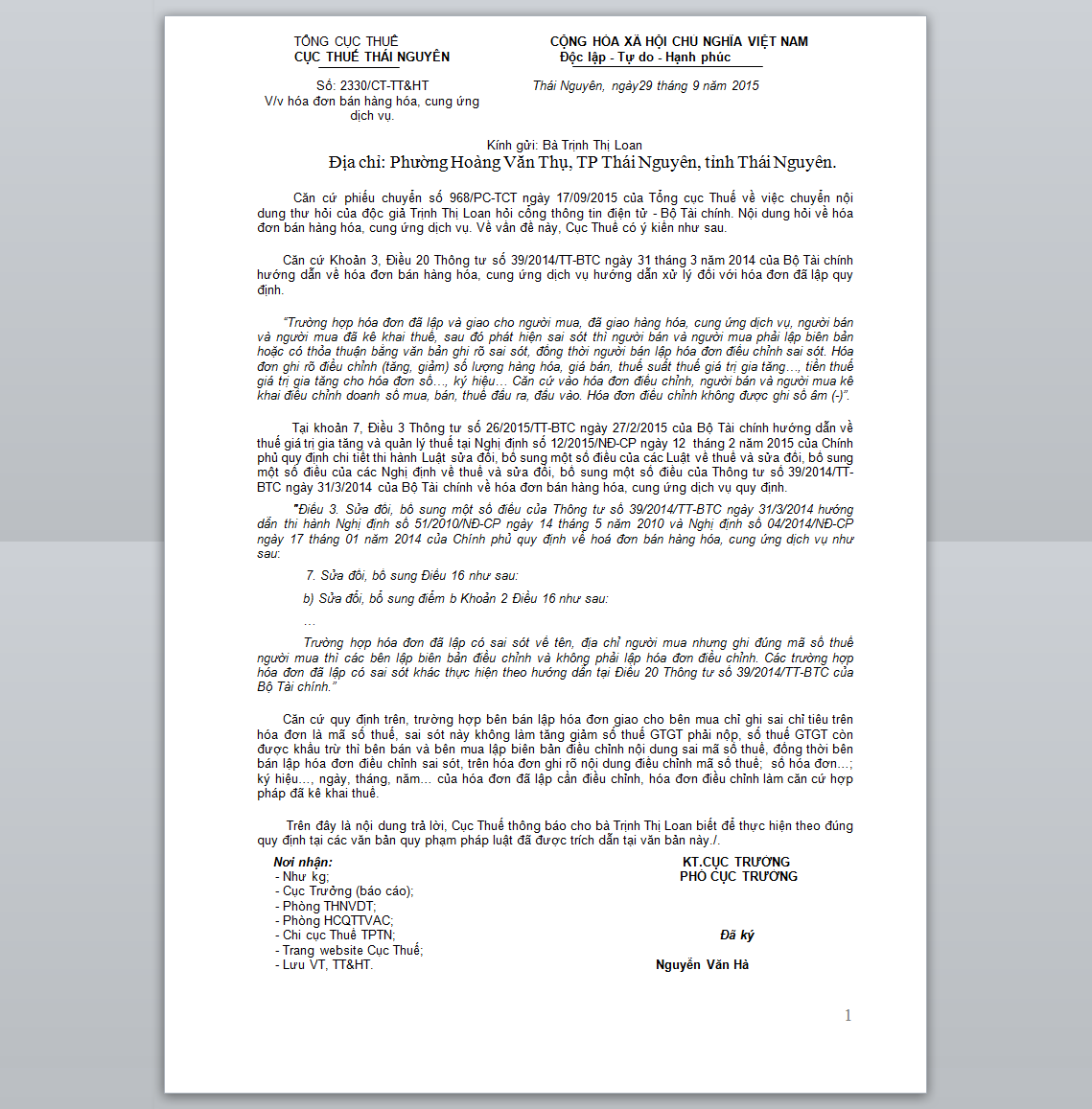 Trên đây là nội dung trả lời, của Cục thuế Thái Nguyên cho bà Trịnh Thị Loan ngày 29/9/2015. Mời các bạn cùng tham khảo công văn này:
