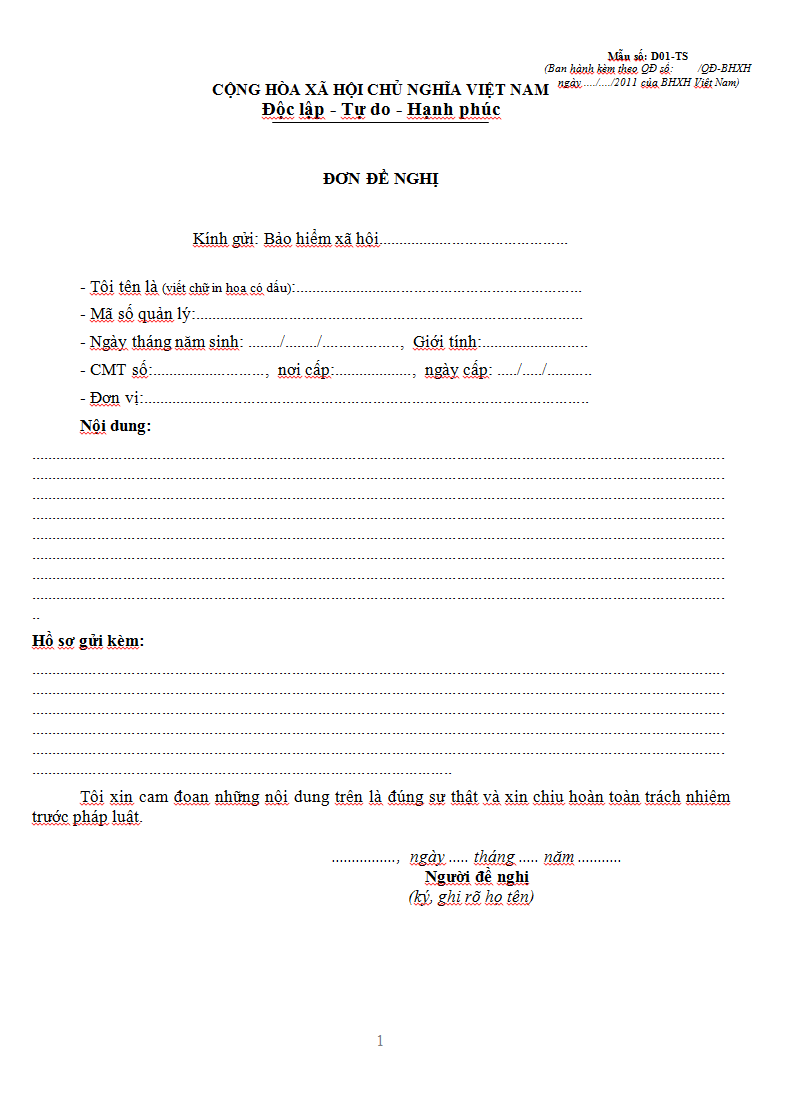 Đơn đề nghị cấp lại sổ BHXH – Mẫu D01-TS