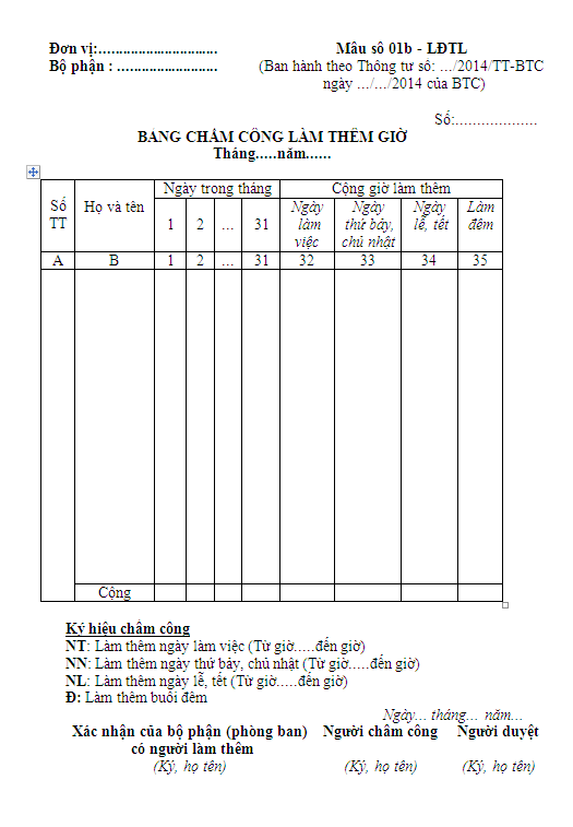 Mẫu bảng chấm công làm thêm giờ theo Thông tư 200/2014/TT-BTC – Mẫu số 01b-LĐTL
