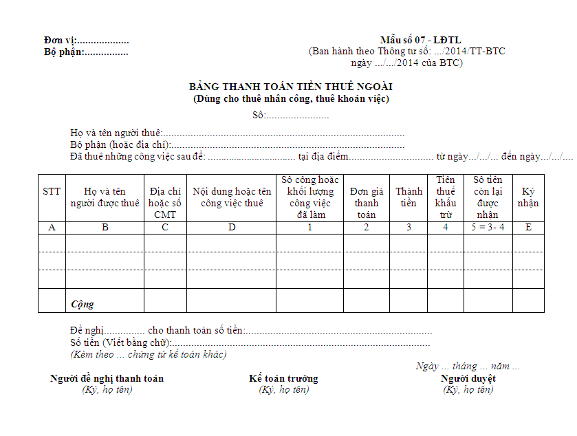 Mẫu Bảng thanh toán tiền thuê ngoài Mẫu số 07 – LĐTL theo Thông tư 200/2014/TT-BTC
