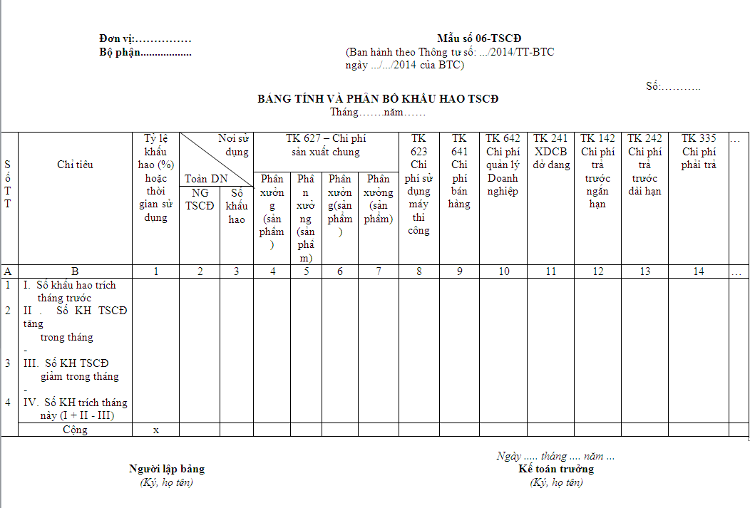 1. Mẫu Bảng tính và phân bổ khấu hao TSCĐ Mẫu số 06 – TSCĐ theo Thông tư 200/2014/TT-BTC