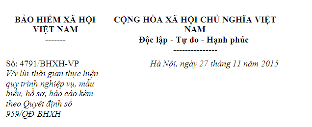 1- Lùi thời gian thực hiện các quy trình nghiệp vụ, biểu mẫu, hồ sơ, báo cáo kèm theo Quyết định số 959/QĐ-BHXH đến hết ngày 31/12/2015. Kể từ ngày 01/01/2016, các quy trình nghiệp vụ, biểu mẫu, hồ sơ, báo cáo kèm theo Quyết định số 959/QĐ-BHXH chính thức có hiệu lực thực hiện. Các nội dung khác của Quyết định này vẫn thực hiện kể từ ngày 01/12/2015.