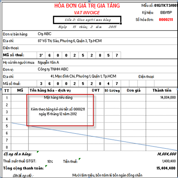 Hóa đơn phải ghi rõ “kèm theo bảng kê số…, ngày…, tháng…. năm…”. Mục “tên hàng” trên hóa đơn chỉ ghi tên gọi chung của mặt hàng.