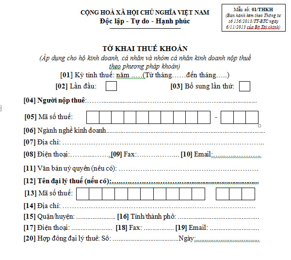 Kế toán Centax xin giới thiệu mẫu Tờ khai thuế khoán 01/THKH ban hành kèm theo Thông tư số 156/2013/TT-BTC ngày 06 tháng 11 năm 2013 của Bộ Tài Chính