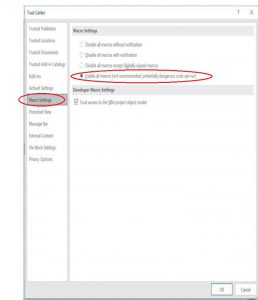 Sau đó các bạn vào Maccro Settings chọn Enable all maccro…>>> kích trút access to the VBA